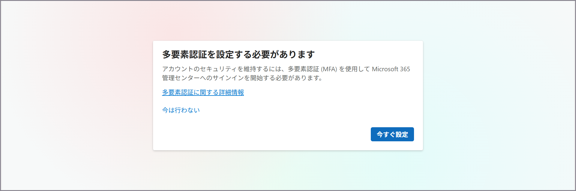 多要素認証が無効なユーザーがMicrosoft 365管理センターにアクセスすると、多要素認証の設定を促すメッセージが表示されます。