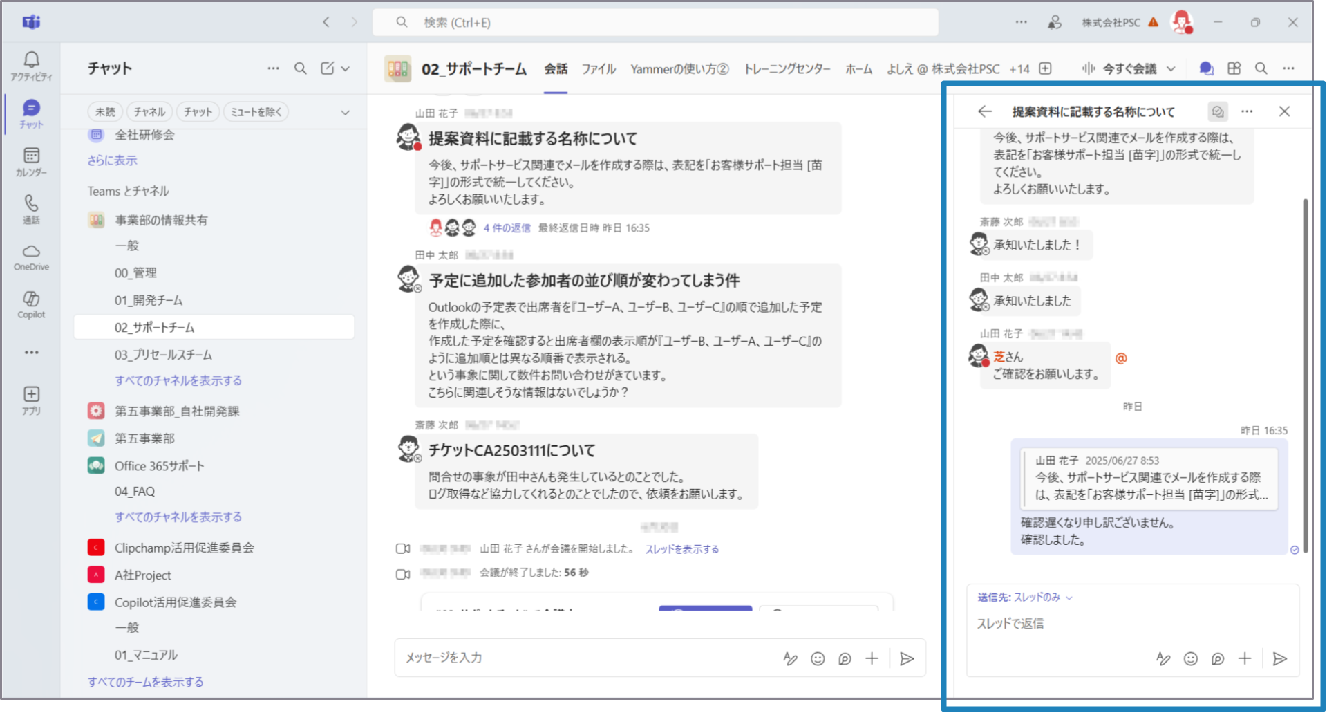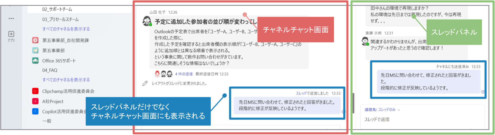 従来、Teamsのチームのチャネルチャットのスレッドにメッセージを返信した場合、メッセージが投稿された順番で追加され、すべてグループ化されて表示されていました。