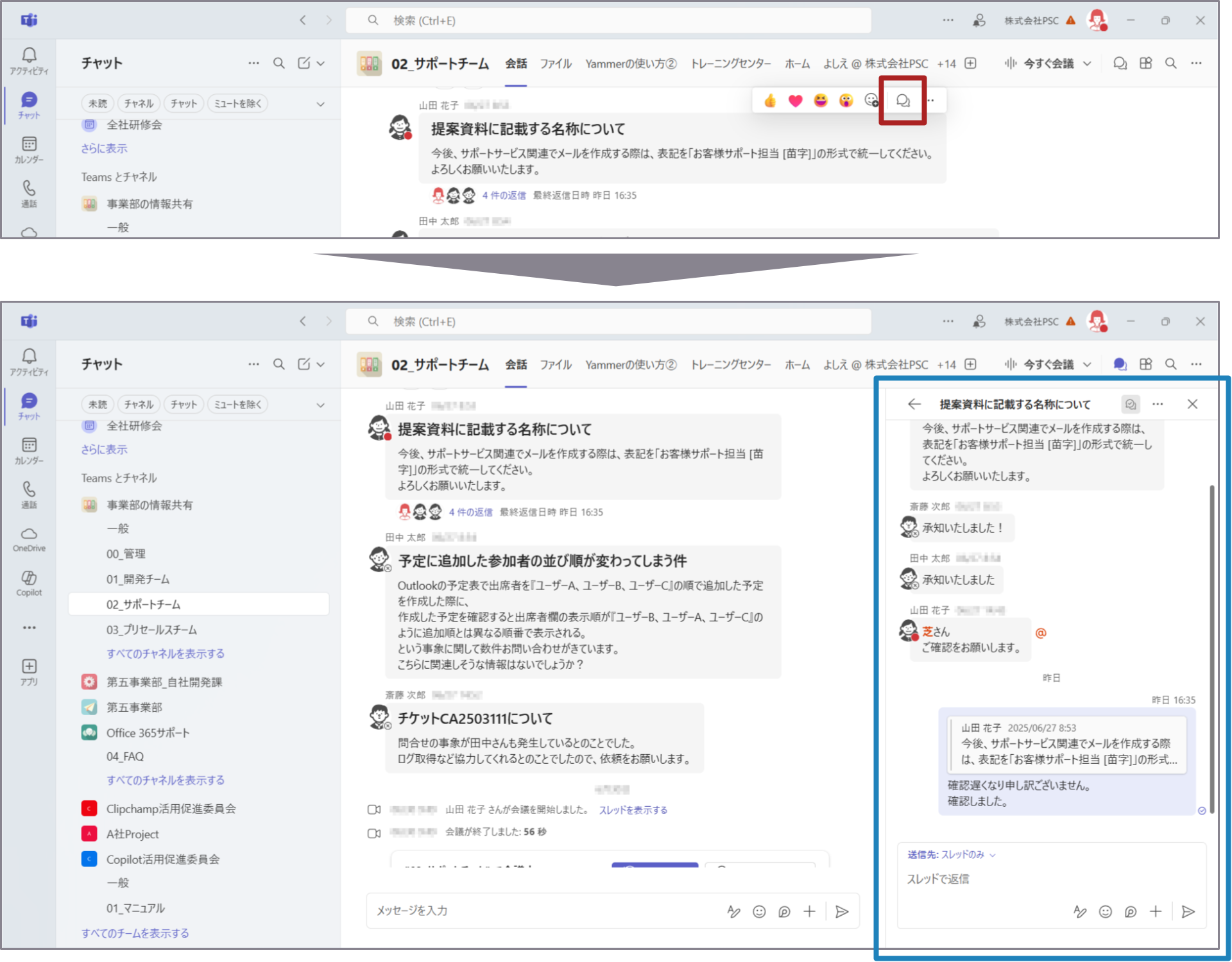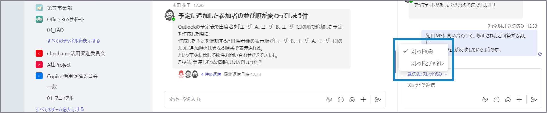 スレッドとチャネルに返信した場合