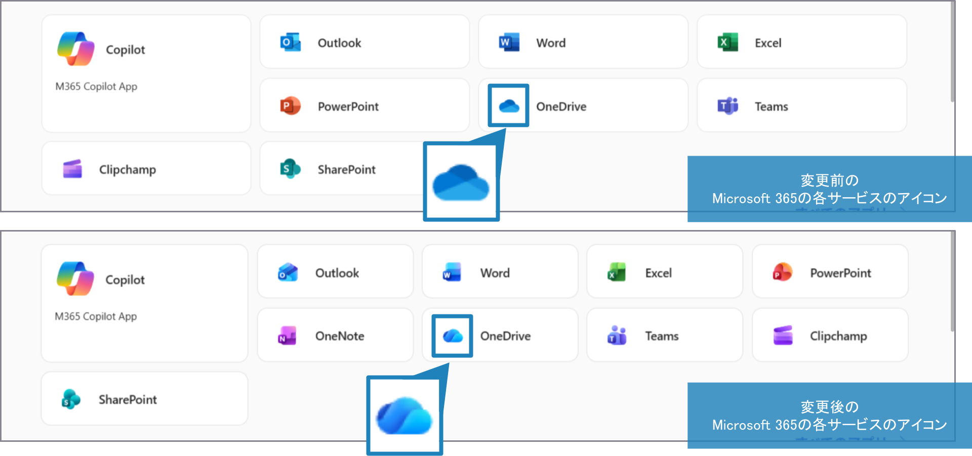 変更前(上)と変更後(下)のMicrosoft 365の各サービスのアイコン
