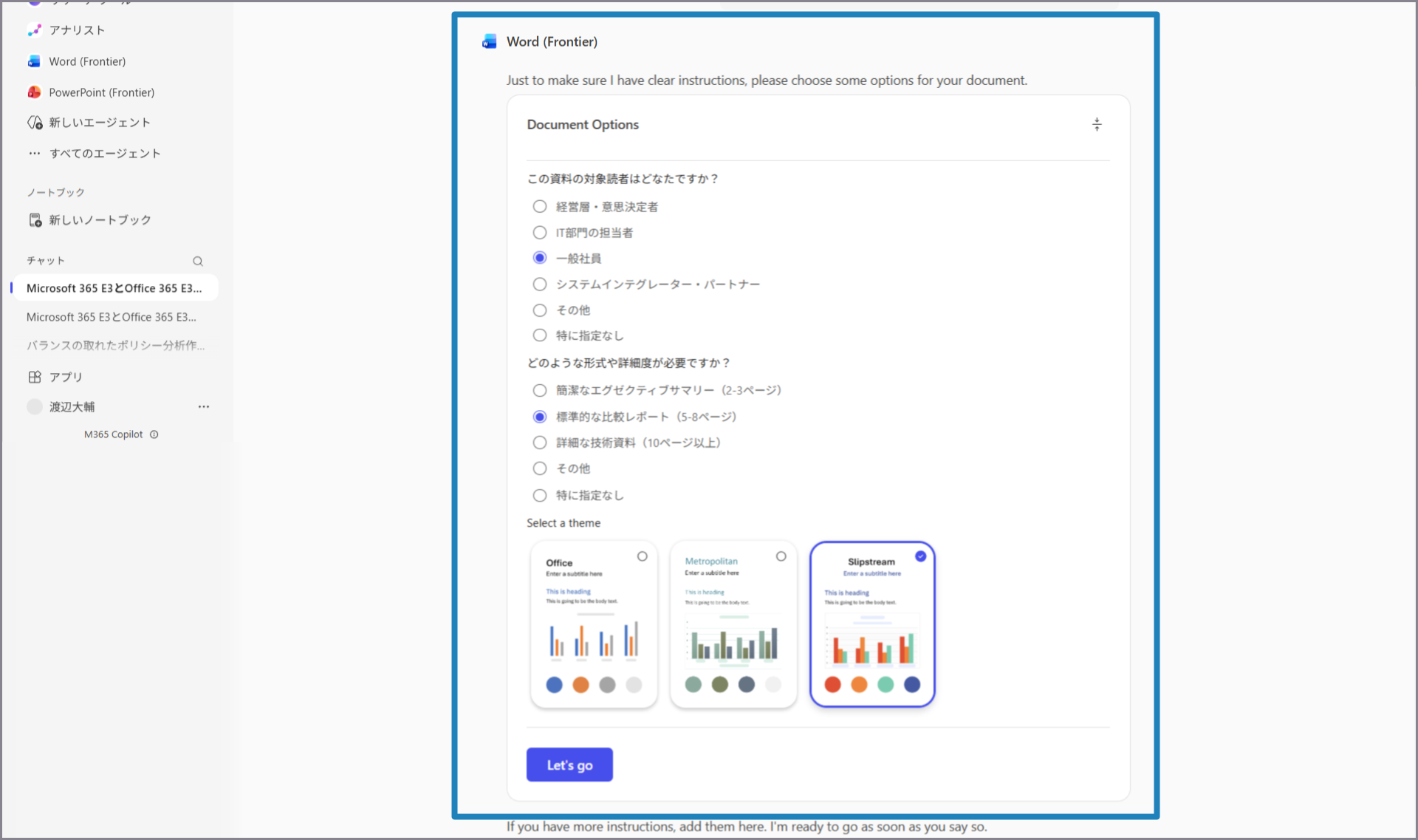 Microsoft 365 Copilotのライセンスが付与されているユーザーに限り、Microsoft 365 Copilotポータル、およびデスクトップ版Microsoft 365 Copilotで、より詳細な情報を段階的に指定してからWordファイルを生成できる "Wordエージェント" を利用できます。