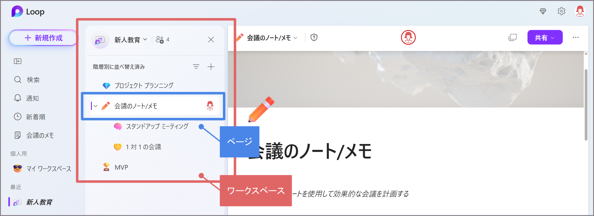 Loopでは、Loopのページをまとめるワークスペースを作成することで、ワークスペースごとにLoopのページを整理できるようになります。